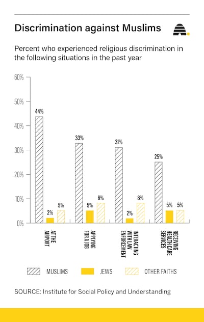 American Muslims also face higher levels of discrimination when applying for jobs (33% of Muslims, 5% of Jews and 8% of faith groups), in interactions with law enforcement (31% of Muslims, 2% of Jews and 8% of others), and even when receiving health care services (25% of Muslims, 5% of Jews and others).