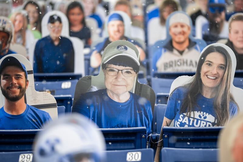 After Pam Woodall died of cancer before the season’s start, Kelli and her father, Randy, submitted photos of her to be included among the cutouts at LaVell Edwards Stadium. “It’s fun to see her showing up on TV,” Gard said.