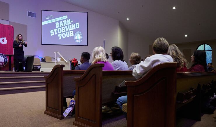 She mounted the stage slightly hobbled by the walking cast she wore for a broken toe. Behind her was a red backdrop proclaiming “Biblical Citizenship Barnstorming Tour,” along with a back-lit Christian cross.