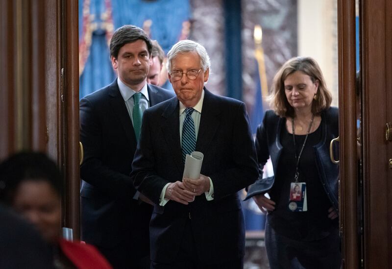 The partisan animosity was on display in McConnell’s remarks before court convened, scoffing at Pelosi’s refusal to accept the Senate’s judgment, “whatever that means,” he said. “Perhaps she will tear it up like she did the president’s speech last night.”