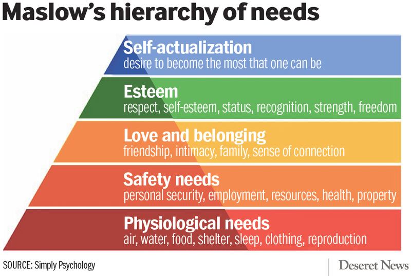 Maslow’s hierarchy underpins both Finkel’s “all-or-nothing” marriage and the soulmate marriage notion. Psychologist Abraham Maslow famously described human needs in terms of a pyramid. The broad base holds universal needs one must satisfy, like food and shelter, before climbing to the next, narrower level to address needs like safety. As each level’s needs are met, one can focus on less basic needs: love and family life, then self-esteem issues like status and freedom.