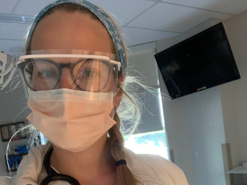 After placing her phone and other personal items in a plastic bin, she pulls on a battery-powered belt and hood — a device that looks like a space helmet, called a PAPR. The belt blows air into the hood, generating pressure that keeps germs from reaching her face. Her face is also covered with a surgical mask and goggles. And she wears a gown and disposable shoe booties.