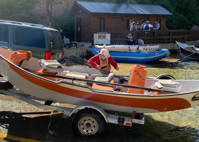 When Holladay’s clients arrive at the shop, another employee takes their temperatures. After passing inspection, they load into Holladay’s truck. She drives them three miles to the to the Flaming Gorge Dam spillway boat launch. A winter’s worth of runoff rips through the power plant below the dam, spinning turbines and providing electricity for around 50,000 homes in seven western states.