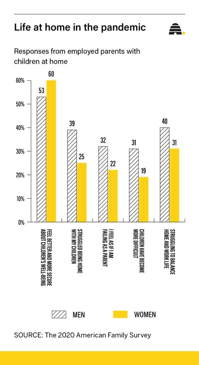 Forced home schooling and household chores have taken a toll on the men. Like their wives, they said they felt better about children’s well-being because schools closed and sent kids home, but 40% of husbands struggled to balance home and work life, versus 31% of women. A comparable 4 in 10 men said they struggled being home with the children, compared to one-quarter of women.