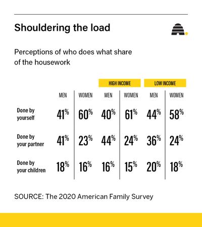 He said it’s possible social norms affect women’s willingness to disclose their feelings, since women have long been expected to manage the house. Karpowitz refers to a “double bind” women often feel: “They don’t feel that the division of labor is optimal, but they also may not feel that they are able to fully disclose how hard it is on them since women have been expected to manage the house.”