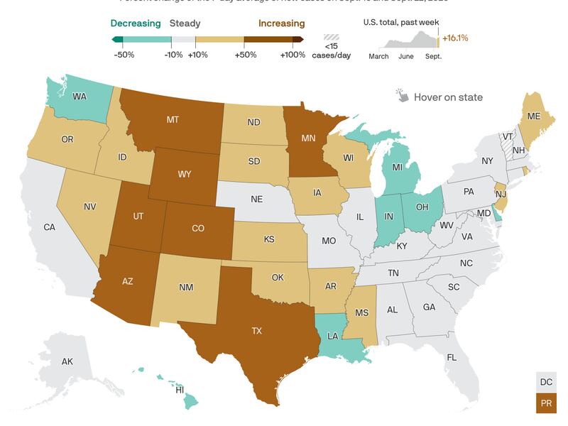 Seven states — including Utah — have seen their 7-day average of coronavirus cases spike by more than 50% in the last week, according to Axios. Cases in Puerto Rico have also risen by more than half.