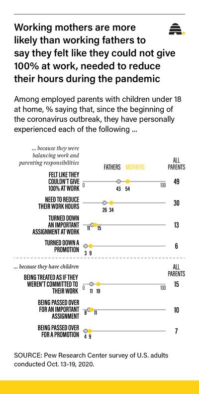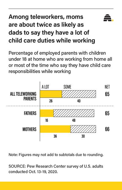 Ruth Igielnik, one of Pew’s senior researchers and the author of the family and work report, said parents worried they could not always give 100% to their jobs because of family needs. Some have had to reduce their work hours or turn down important assignments or promotions. Lots experienced a variation of what she called “extreme challenges that teleworking parents who have child care responsibilities run into while they’re working.”