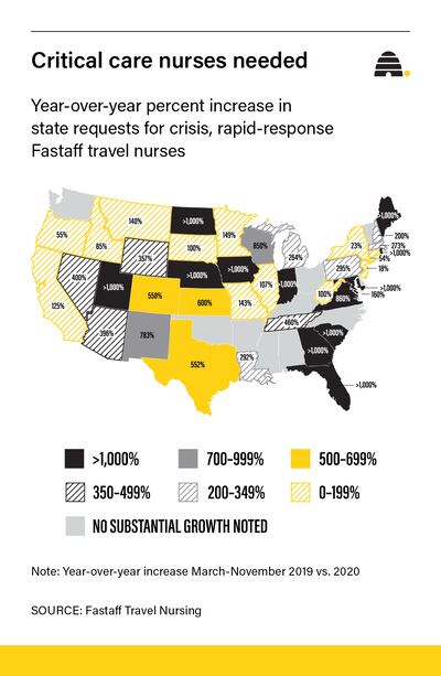 He acknowledges traveling wages are extremely high right now, but even in non-pandemic situations, a trained ICU nurse hired by a hospital for an eight- or 13-week crisis contract makes more than a staff nurse. Such nurses don’t need to be trained by the hospital or paid a yearly salary and benefits, so it’s an expense many hospitals are willing to bear.