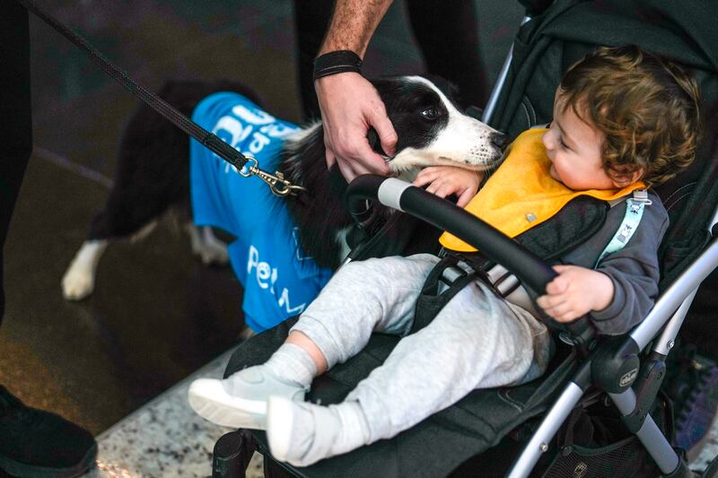 According to The Associated Press, the dogs work during the peak travel hours of 10 a.m. to 4 p.m., although their veterinarian said their hours may vary depending on the dog’s temperament. Each dog is assigned a handler, who cares for the canines and facilitates interactions with airport guests.