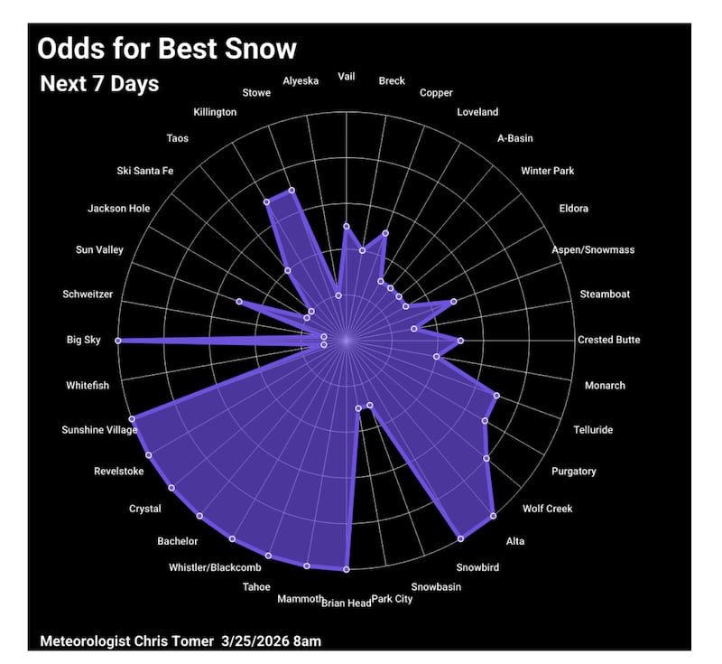 OnTheSnow meteorologist Chris Tomer is predicting moderate to heavy snow accumulation in Utah mountains March 31 through April 4. His forecast calls for 6 to 12 inches across the Wasatch, with the higher totals at Solitude, Brighton, Alta and Snowbird. Brian Head in southern Utah could see a foot of new snow.