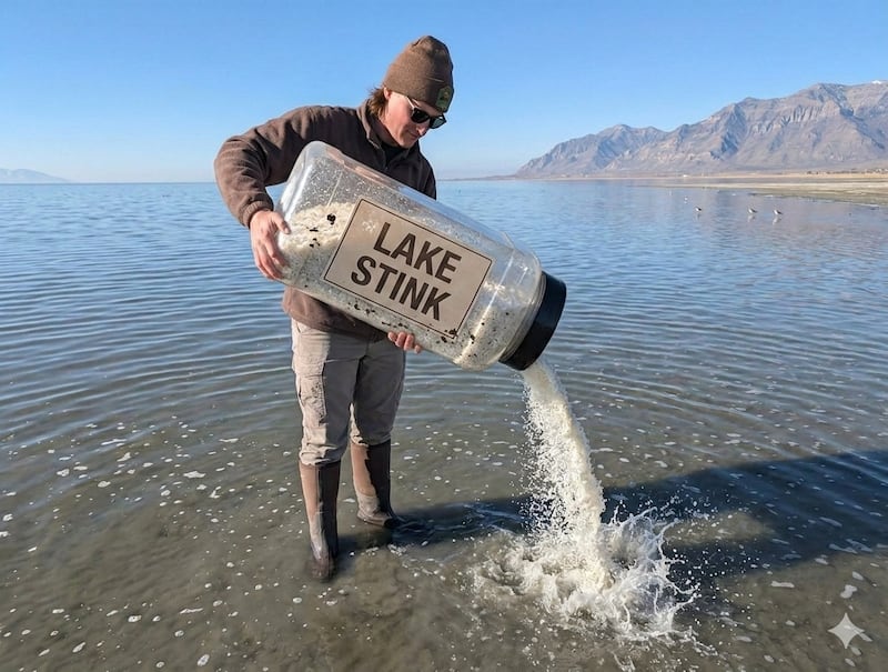 A Facebook post from the Great Salt Lake State Park jokes that park rangers are “hand-pouring freshly harvested, concentrated ‘Lake Stink’ back into the shoreline,” adding, “it’s not a true Utah summer unless you can smell the lake from I-15.”