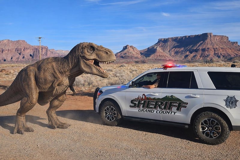 The Grand County Sheriff’s Office in Moab reports a dinosaur sighting, stating they stopped an “unregistered prehistoric vehicle” for speeding, failing to signal, and lacking proof of insurance from 65 million years ago.