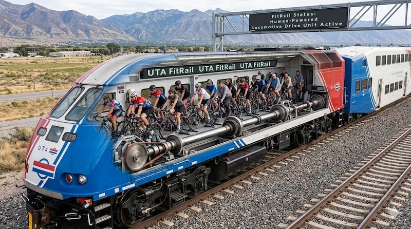 Planned FitRail features include tandem pedal stations, optional size 15 cycling shoes sponsored by the Utah Jazz, and a weekly leaderboard for top kilowatt generation.