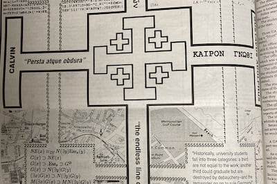 Bryan Hance, a freshman from a small suburb in central Ohio, scanned those stories and continued to thumb through the paper until he paused, finally, on page 16. He’d never seen anything quite like it. A full-page advertisement jumbled with maps, math, portraits, words and phrases he couldn’t make sense of. The ad referred to a group called “The Orphanage.” “MAY DAY” appeared in big bold letters at the top, and toward the bottom, a small illustration of a smirking man with two dots for eyes and ears drawn like potatoes. Hance was bewildered. Maybe this was the work of a fraternity? Or cobbled together during a fever dream?