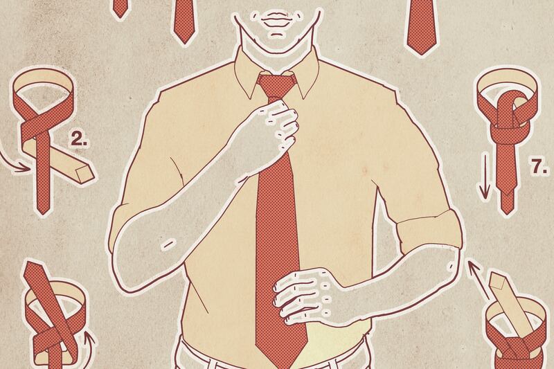 First, hang the tie around your neck and cross the two ends, wide over skinny. Wrap the big end behind the small one, pull it up through the neckhole, then down toward the floor. Loop it around the front in the same direction, feed it up through the neckhole again, then down through that same loop. Pull the whole thing tight. Clasp the skinny end and shimmy the little triangle toward your neck. If the tip doesn’t align with your belt, start over. Confused? So was I. But my dad would not do it for me, so I practiced. Over and over and over. Manhood, after all, was not about wearing a knot below my Adam’s apple; it was about putting it there myself.
