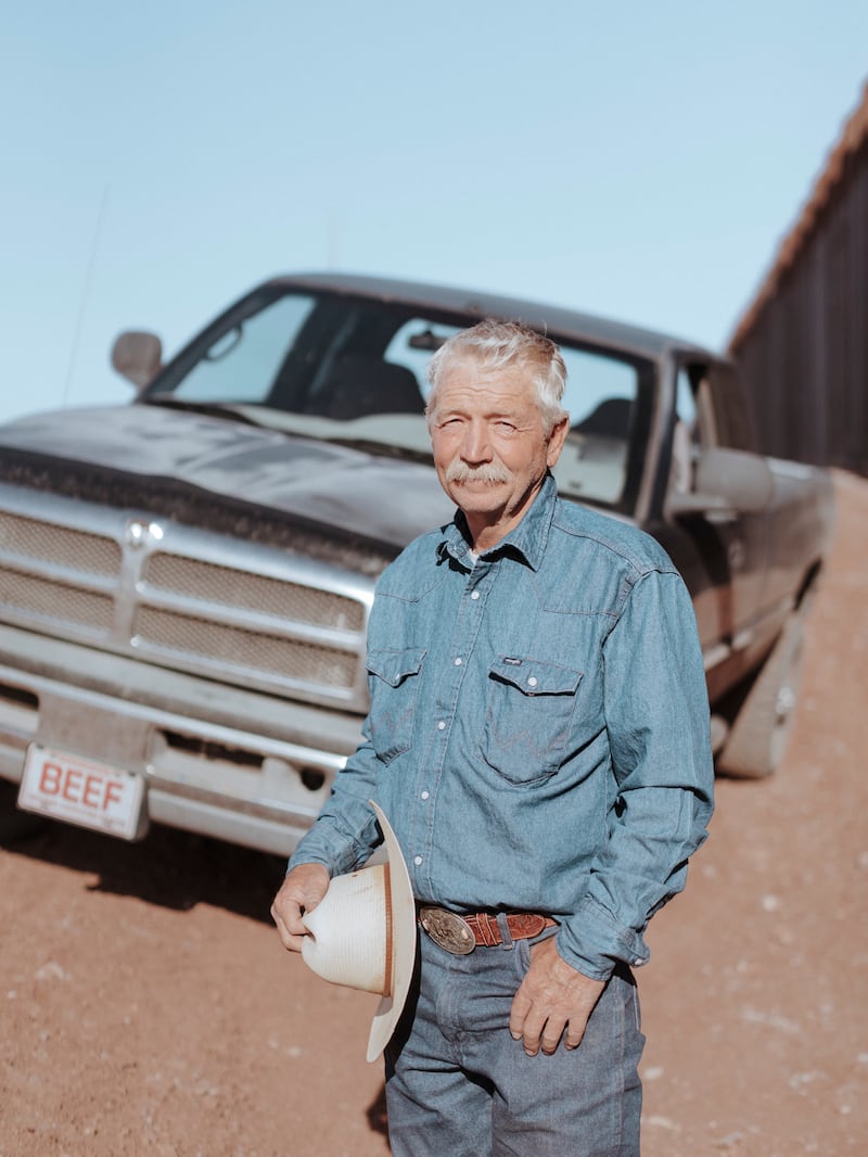 Ladd’s portrait turned out. In it, he stands in front of his pickup truck, coated in a fine layer of red dust with a license plate that reads “BEEF.”