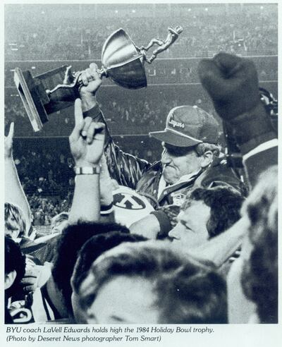 Bosco scrambles for 10 yards to open BYU’s final drive of the 1984 Holiday Bowl. He limps forward and, a few plays later, he hobbles up in the pocket and drops a looping pass to his halfback. “The guts of this young man (are) just unbelievable,” one announcer says. “One of the most courageous young men I have seen,” says the other. He needs help getting up after taking yet another hit, but with about a minute left, he steps up, evades defenders one last time, and hits Kelly Smith to claim the lead. An interception from Allen seals the victory, and the Cougars carry coach Edwards off the field. Twelve days later, The Associated Press, UPI Coaches Poll, and others declare BYU the 1984 national champion.