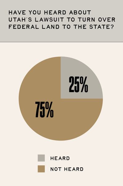 The vast majority of Utahns polled, 86 percent, say that public lands should stay public and not sold to private interests. But that opinion is mitigated with a touch of skepticism. Some 43 percent of respondents believe the state would sell those lands to the highest bidder. To that suggestion, Gov. Spencer Cox is unequivocal: “There’s no intention to sell lands off.” He adds, however, that Lee is working on a bill in which states would take over federal land within city limits to sell to developers for much needed housing. “That has nothing to do with these vast landscapes that we’re talking about” with the lawsuits, says Cox. “‘Public lands’ means nothing if they’re not open to the public. And that’s what we’re trying to do, is to keep public lands public.”