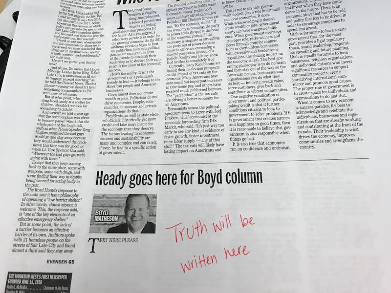 In 2018, early in my stint as opinion editor, I had been wanting to write about truth. In May I informed my editorial assistant, Christian Sagers, of my intent to write on truth that week. As my Thursday spun into unexpected meetings and my writing time evaporated, I told him to just hold my spot on the page. At 5 p.m., while I was in the middle of playing guest host on a national radio program, Christian brought me the proofs for the printed paper. At the bottom the page was my picture and a placeholder headline. In red pen Christian had scrawled, “Truth will be written here.”