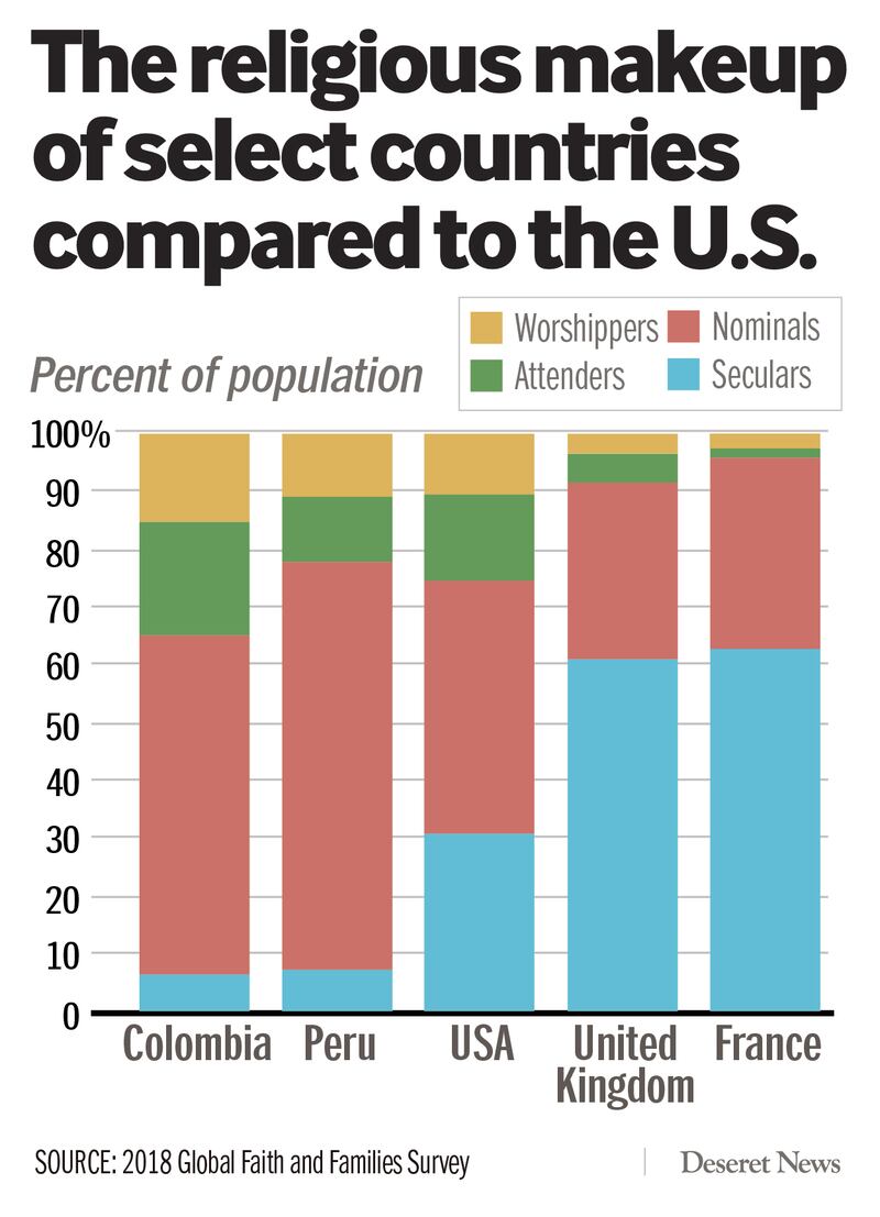 For instance, the percentage of people who attend church at least weekly in the United States is similar to the percentages found in Colombia and Peru. But the United States also boasts a large number of seculars, with nearly 30% of the population reporting no religious activity.