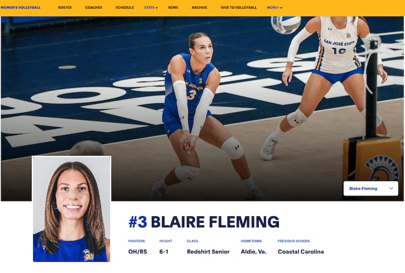 The sport in which the rebellion has begun is women’s volleyball, specifically in the Mountain West Conference. One of the teams in that conference is San Jose State University, which has on its team roster 6′ 1″ Blaire Fleming. Fleming transferred to San Jose State after playing in South Carolina but before a bill was passed in that state that would have banned Fleming’s participation. An interesting coda is that it is unclear that San Jose State even knew Fleming was transgender when the transfer occurred.