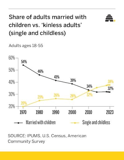 Taylor’s experience is emblematic of the growing pattern of “kinlessness” for many American adults today. With rates of marriage and fertility continuing to decline, more and more Americans adults could be facing a kinless future (without a spouse or kids of their own), along with lonelier holidays. In fact, starting in the past decade, the share of “kinless” prime-aged (18-55) adults — defined here as those who are never married and have no children in the home — exceeded the share of Americans who are married with children for the first time in our nation’s history.