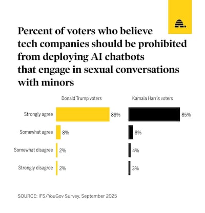 A September survey from the Institute for Family Studies found that Americans want Congress to prioritize protecting children from AI-related harms by a margin of 9 to 1. The same survey found that 88% of Donald Trump voters and 85% of Kamala Harris voters strongly agree that tech companies should be prohibited from providing access to chatbots that engage in sexual conversations with minors.