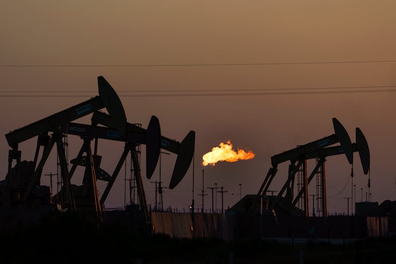 A flare burns off methane and other hydrocarbons as oil pumpjacks operate in the Permian Basin in Midland, Texas, Oct. 12, 2021. | David Goldman, Associated Press