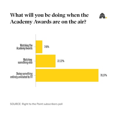 As for the Right to the Point community, most of us had better things to do than watch, with more than 70% saying in our entirely unscientific poll of subscribers last week that we wouldn’t even be watching TV while the Oscars were on.