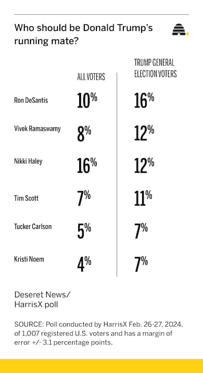According to a Deseret News/HarrisX poll of registered Republican voters nationally, 18% said DeSantis is their top pick to be Trump’s vice president. He was followed by Vivek Ramaswamy (15%), within the margin of error. The next highest picks were Nikki Haley (12%) and Tim Scott (9%).