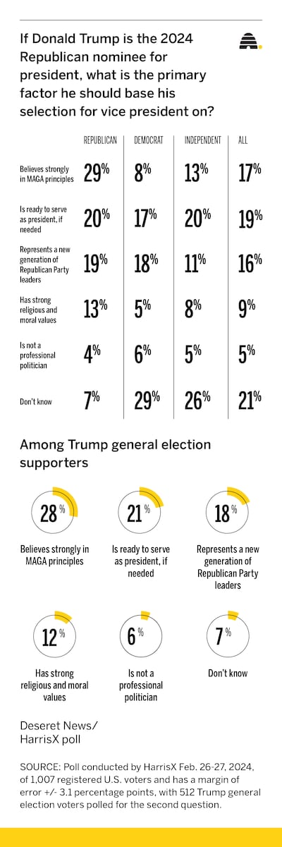 When asked how Trump should make his selection for vice president, a plurality of GOP voters — 28% — said the person should “believe strongly in the MAGA principles.” Other qualifications — like being ready to serve as president if needed (21%) and representing a new generation of GOP leaders (19%) — followed.