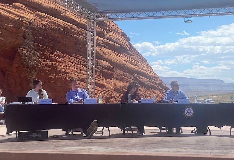 The hearing was held outdoors at the “Rock Bowl,” in a new development near Sand Hollow State Park in Hurricane, Utah, on an unusually warm April day. The over-capacity crowd sat on folding chairs and blankets in a venue surrounded by the region’s distinctive red rocks.