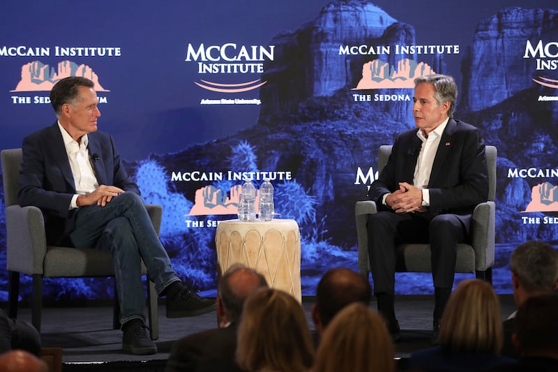 Romney interviewed Blinken at the McCain Institute’s 2024 Sedona Forum, held Friday and Saturday in Sedona, Arizona. They discussed the war in Gaza, and the possibilities for a cease-fire, as well as the relationship between China and the U.S., and the continuing war in Ukraine.