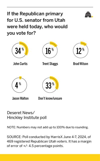 A new poll conducted by HarrisX for the Deseret News and the University of Utah’s Hinckley Institute of Politics shows Curtis ahead with 34% support among registered Republican voters, while Staggs has 16%, former Utah House Speaker Brad Wilson has 12%, and Moxie Pest Control CEO Jason Walton is at 4%. Another 33% of voters said they were unsure.