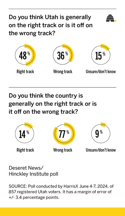 The general discontent about the economy seeps into who voters plan to support in the general election. Just 20% of Utah voters say they think the U.S. economy is on the right track, while 72% say it is on the wrong track. But among those who say they’ll vote for Biden, a plurality — 47% — think the country is on the right track; among Trump supporters in the state, that figure is down to 12%.