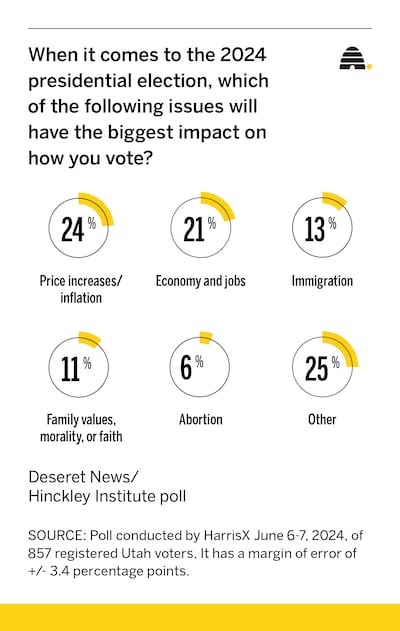 When Utah voters were asked which issues are most impactful to their vote, financial issues were the most frequent responses: price increases and inflation (24%), and the economy and jobs (21%). Another 13% said immigration was their top issue; 11% said “family values, morality, or faith.”