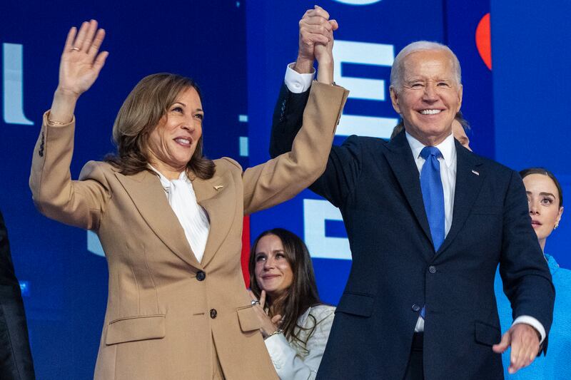 Biden praised Harris, who he introduced as the “first Black vice president of South Asian descent,” as a capable leader, and promised the audience that she would carry the country forward.