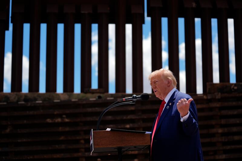 Trump spoke for nearly an hour, framed on one side by an unfinished portion of the 30-foot border wall constructed during his first administration, and on the other side by the ragged peaks of Montezuma Pass.