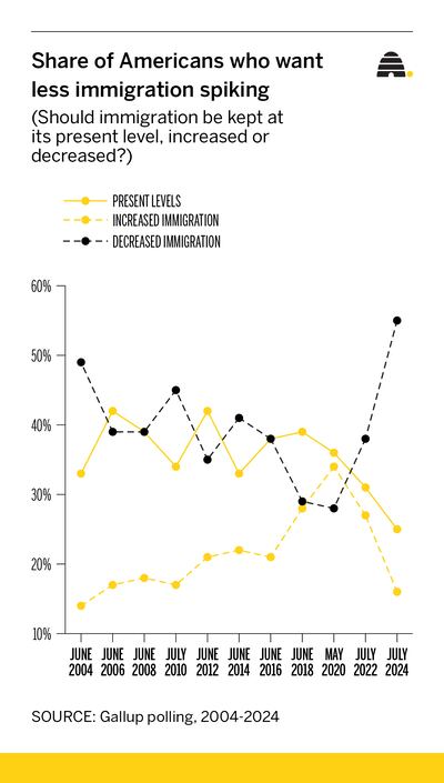 Public opinion on immigration policy fluctuates, but for much of the 21st century, Americans have regarded immigration — and its benefits to society — either positively or with indifference. But in recent years, as illegal border crossings reached record levels, public perception has undergone a notable shift. Half of Americans, including 42% of Democrats, favor mass deportations of unauthorized immigrants, according to an Axios/Harris survey. (That was a fringe view in 2016 exit polls.) A majority of Americans now think immigrants today have “worse character” than immigrants 50 years ago did, per the same survey.