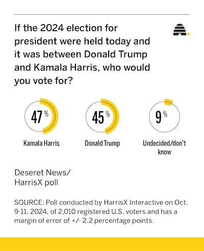 Vice President Kamala Harris holds a narrow lead over former President Donald Trump, according to the latest Deseret News/HarrisX poll.