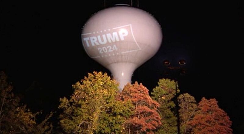 Then there’s the water tower in Hanson, about an hour’s drive away from Tattersall’s sign. The words “Trump 2024″ are being projected on the water tower at night by a local resident, despite a $100-a-day fine and the town’s efforts to block out the words with bright lights. That’s not the only municipal battle over Trump signage; the CEO of Sticker Mule said he was prepared to go to jail over the enormous illuminated Trump sign he had installed atop the company headquarters in Amsterdam, New York. (Turns out jail time wasn’t necessary; at the last minute, a judge ruled that the sign could be lit.)