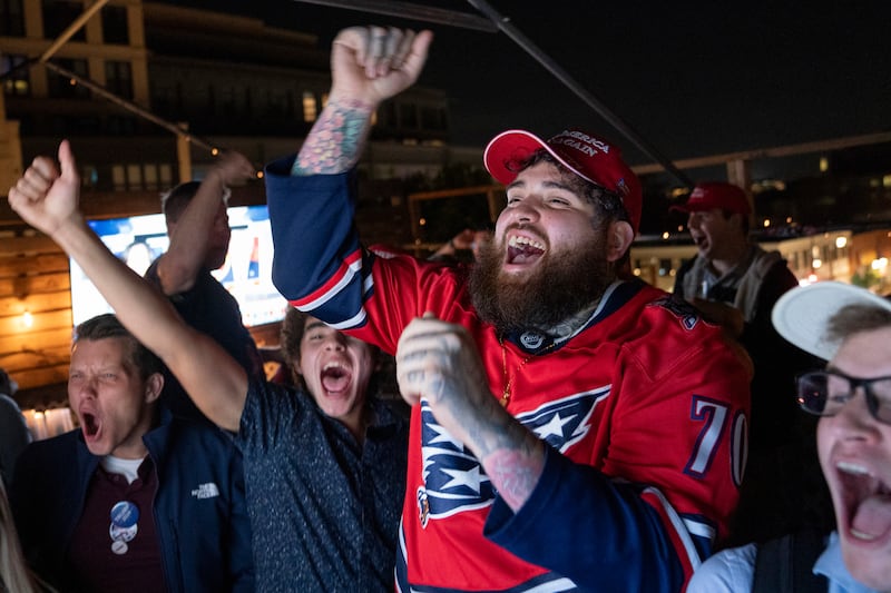 And when the news programs went to break, “Better Off With Trump” took over the screens. As the night wore on, the Village People’s “Y.M.C.A.” pumped some energy into the crowd, many of whom were on their feet for hours due to a scarcity of chairs, which seemed more prized than the MAGA hats.