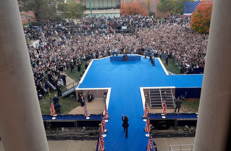 An hour before Harris took the lectern, Harrison walked down Barry Place, a side street near Howard’s campus, headed toward the event. He looked as if he formed part of a funeral procession — head dipped, eyes somber, shuffling slowly. Some passersby stopped to greet him. “Thanks for all you did,” one in a HARRIS-WALZ T-shirt said. Harrison was gracious — he shook hands and offered slight nods of his head. But he didn’t say a word.