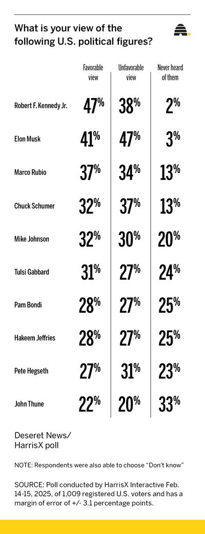 - Robert F. Kennedy Jr. emerges as the most favorably viewed political figure with 47% approval and significant cross-party support, while Elon Musk appears as the most polarizing figure.