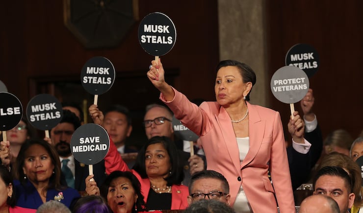 Other Democrats protested more subtly, with at least a dozen lawmakers holding up signs that read: “Musk Steals,” “Save Medicaid,” and “Protect Veterans.”