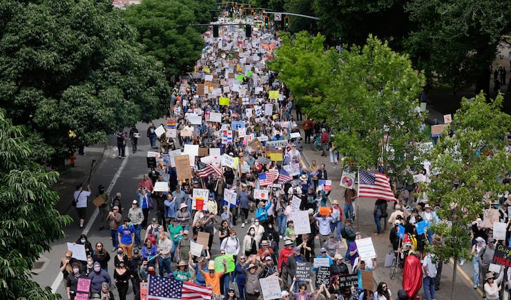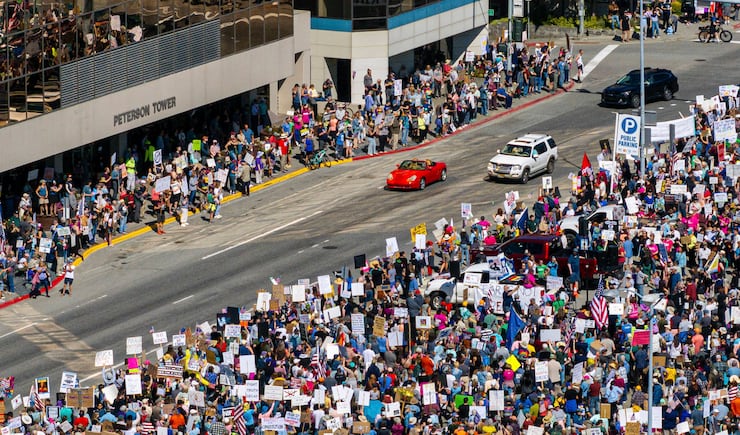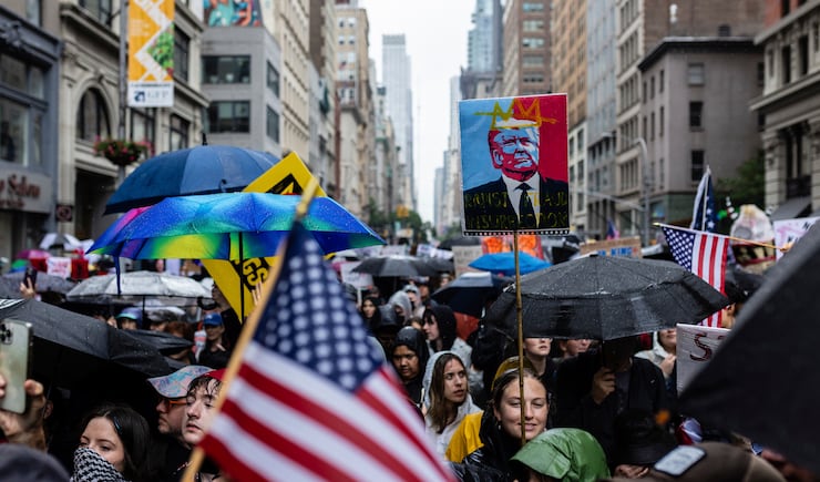 New York City garnered a larger crowd comparable to Portland’s. About 50,000 took part in the No Kings demonstrations Saturday. Police made at least 12 arrests throughout the protests.