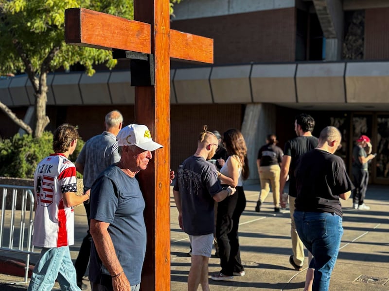 Dan Beazley, of Northville, Mich., stood outside the stadium with his 10-foot cross ahead of the vigil, offering attendees prayers, as he had the day before, outside the TPUSA headquarters. He leaned on the cross, guarding his sunburnt face.
