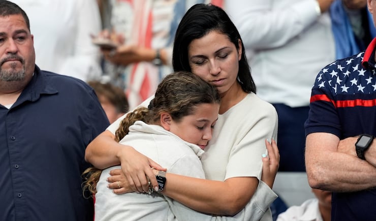 Trump called Erika Kirk to the stage after giving his remarks. She gave him a tight hug as they faced the audience for a final blessing to Kirk.
