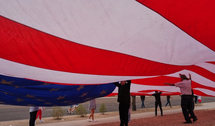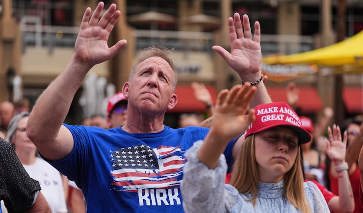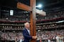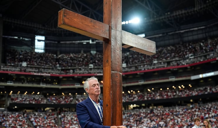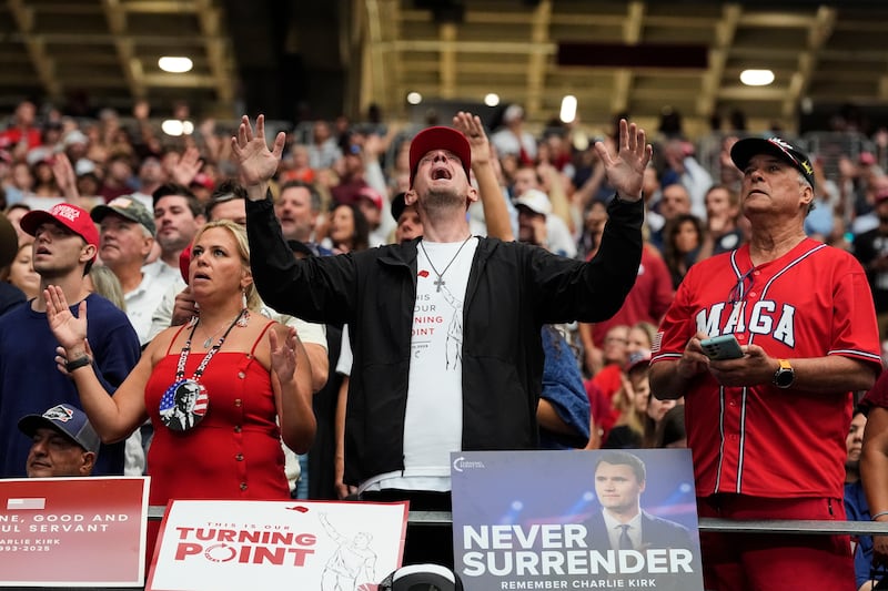 Ahead of the programming, Dan Beazely, a Michigan resident who traveled to Arizona following the assassination, circled the stadium, wheeling a 10-foot cross around with him. He offered prayers at the center of the stadium.