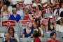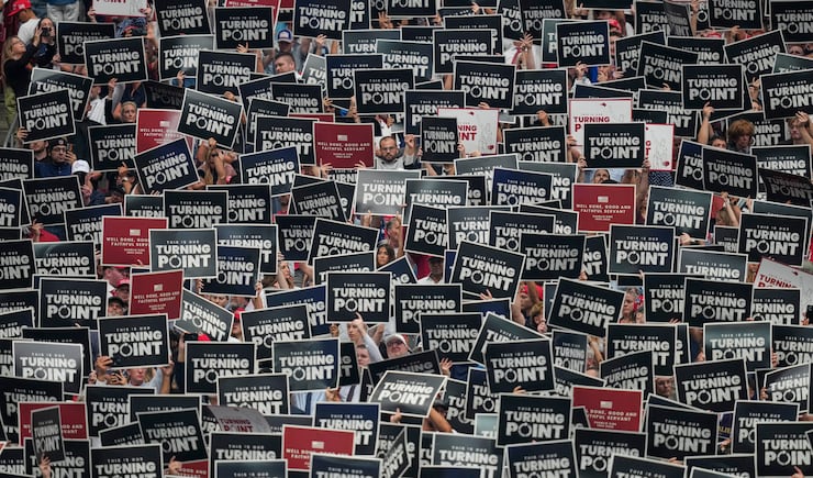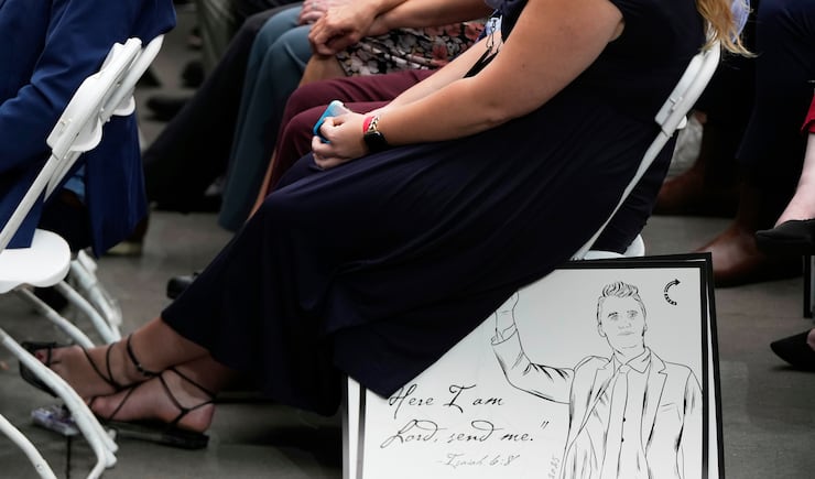 As attendees entered the stadium, they found a travel size pack of tissues and signs with photos of Kirk laid out on the floor seats. One of the signs quoted Isaiah 6:8: “Here I am Lord, send me,” another said “Never surrender” with a photo of Kirk on it. American flags were draped on both sides of the stage.
